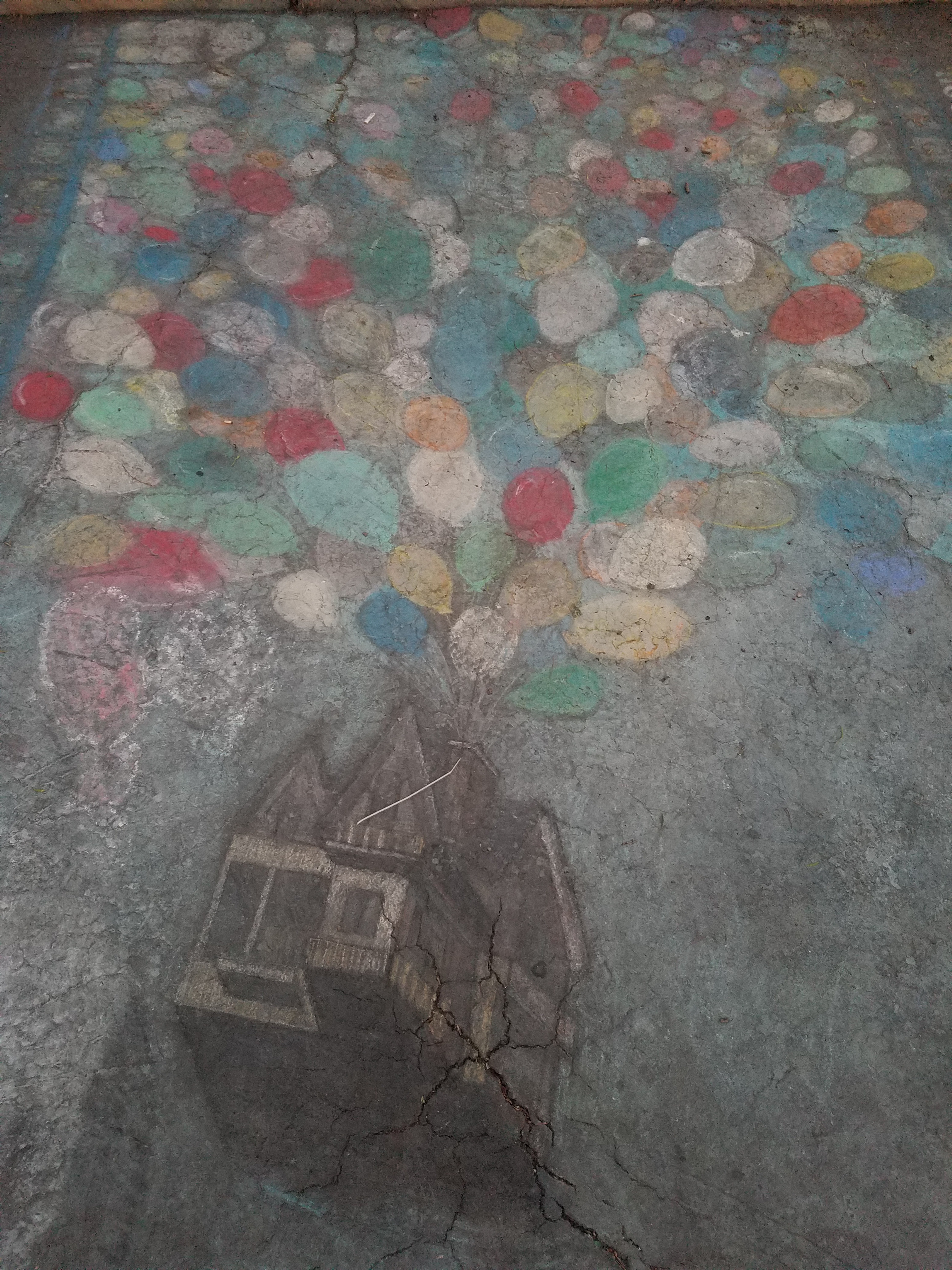 If you travel at the right time, you might be able to catch one of the chalk festivals that occur annually. The image to the left–of Disney Pixar’s “Up”–is from one of the artists that attended the festival in late May 2016. Seeing as my trip occurred in late August, I took this picture and realized that the drought saved this work of art.