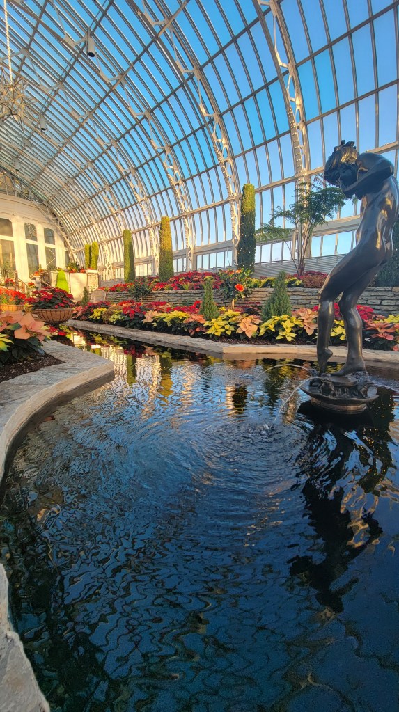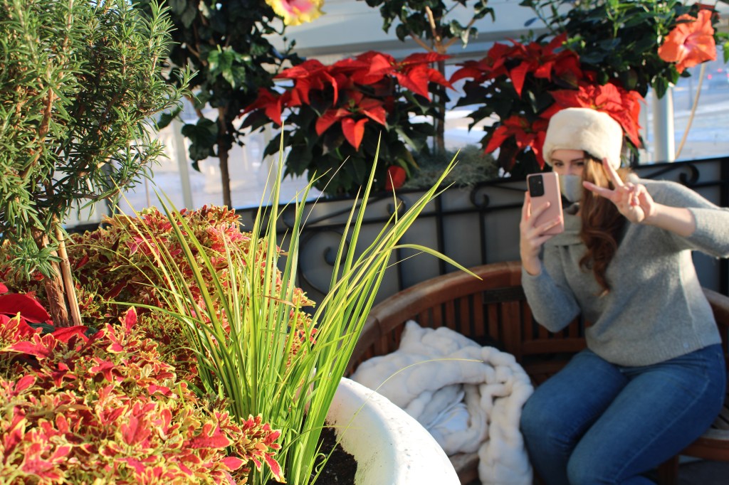 It was a blessing to enter the humid glass buildings. My skin loved the warmth and coastal-like atmosphere. After living on the southern coasts for five years, my skin wasn’t ready for the harsh Minnesota reality of single-digit temperatures. Needless to say, my skin was soaking in every drop of hydration it could get. Including the sweat I was working up from wearing my winter coat and sweater inside. The drastic temperature differences from outside to inside felt like a battle between Heat Miser and Snow Miser. I almost envied the families with strollers because they had a place to put their heavy winter gear. As a content creator, I like having free hands to capture moments as they happen but carrying my bulky outer layers tends to hinder that. Speaking of which, I was glad to get a few decent shots despite the baggage I was carrying. The golden hour set on the Sunken Garden’s holiday flowers making them a little more magical. I’ll let the pictures speak for themselves.