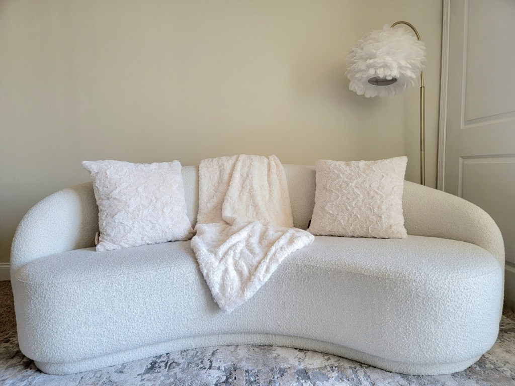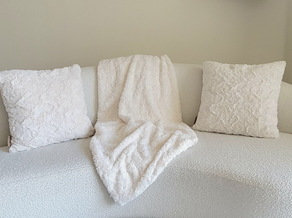 I spent my teenage years wearing off-brand Ugg boots which inspired my twenty-eight-year-old self to dive into the cozier side of my apartment. I’m always a fan of keeping things simple and neat. I stick with monochromatic themes while adding accented pieces to add pops of color. I love cuddling up to these Koolaburra pillows with the blanket snuggling my legs while I read a book and sip hot cider before bed.