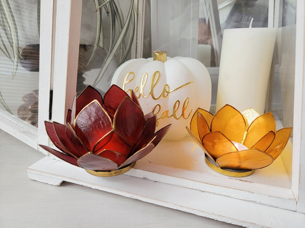 Shop: (Similar) Wax Pumpkin; (Similar) Lotus Tealight Holders