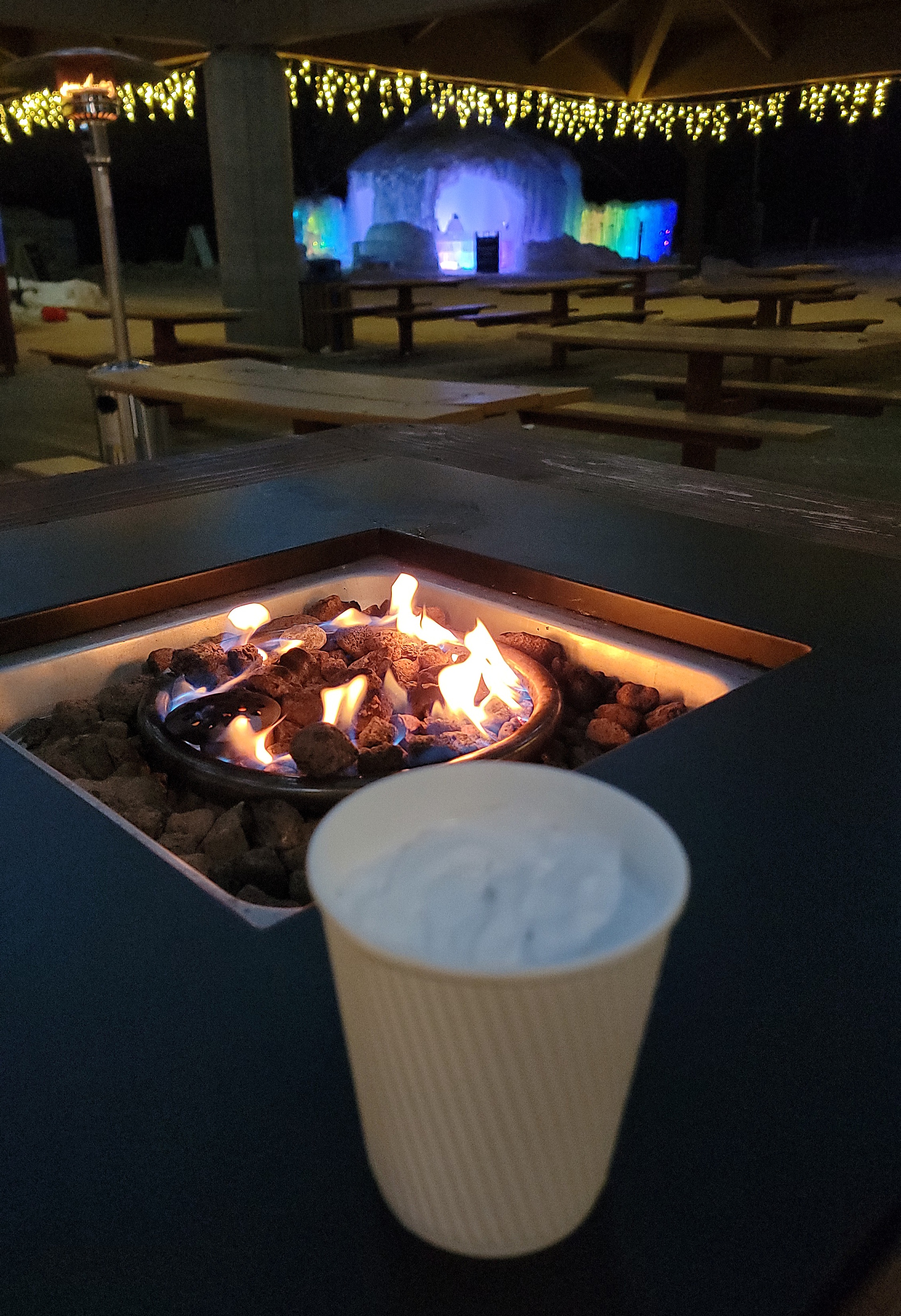To exit the ice castle, guests walk through enchanted lights and follow the path to the fire pits and picnic area. Food, souvenirs, and adult beverages are available in this area for purchase. The adult beverages are served from the polar ice bar which was an igloo made entirely of ice. The bar tender was extremely kind and even after it was closed, she served me an adult hot cocoa upon request. I was hoping to get a virgin drink but I was informed both the cider and the hot coca were premixed with alcohol. Still, the drink tasted great and it was the perfect temperature to drink.