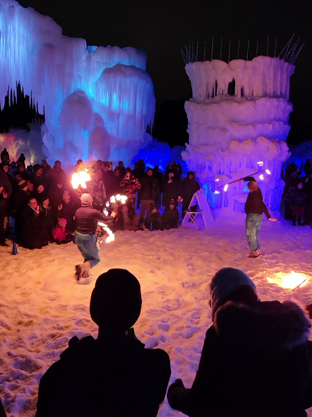 After trying the slides once, we explored colored tunnels, crawl spaces, photo op spots, and viewed ice sculptures near the fountain. There was so much open space that it didn’t feel as crowded as it could have. There seemed to be a natural flow of people following the ice castle paths counterclockwise from the entrance. Especially after the fire dancers had finished their routine. I didn’t catch the entire show but it was spectacular near the end.