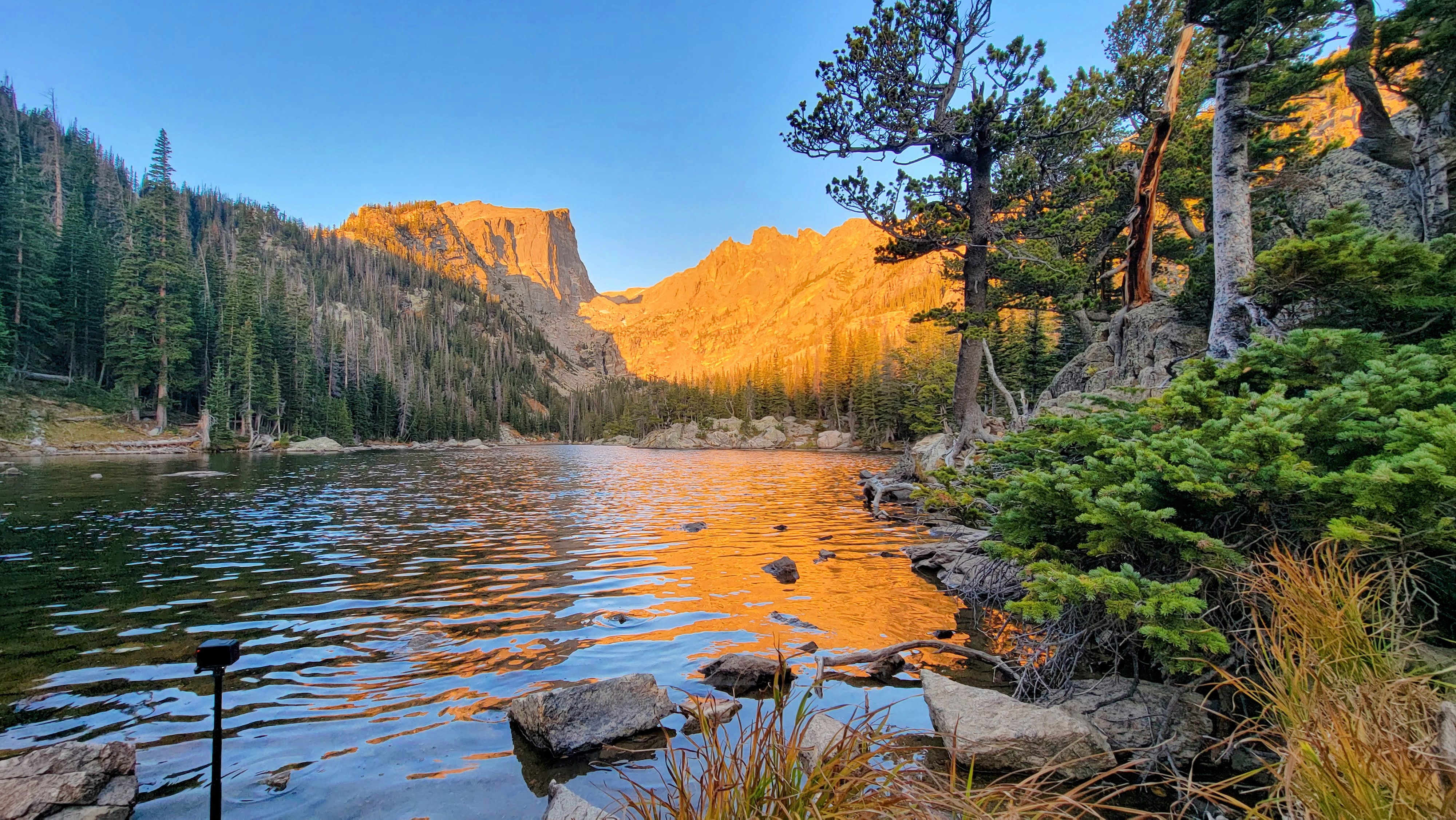 The trail led us on a dark, rugged path, past the sound of distant streams, and gradually opened up as we neared our first destination. After spending hours researching the five lakes on the trail, I planned to film my sunrise Reiki session at Dream Lake. Believing it was the ideal spot for catching the first light above the peaks. It was still dark when we arrived, but there was a faint glow over the horizon. I needed to set up my cameras carefully to avoid disturbing the view for other possible hikers following far behind us. I placed the GoPros low on the lake’s surface, concealed by boulders, and found my perch beside my mother.
